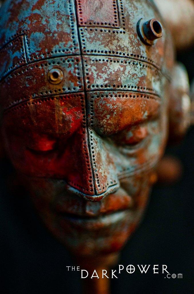 This a mixed media sculpture mostly made out of a bunch of old junk. The front of the head is sculpted in super sculpey, but the back is an old light which I cut to shape. The rest is comprised of old bottle tops and some deodorant bottles.