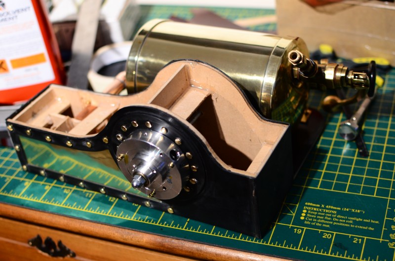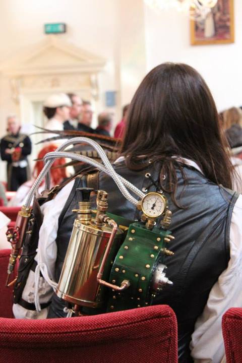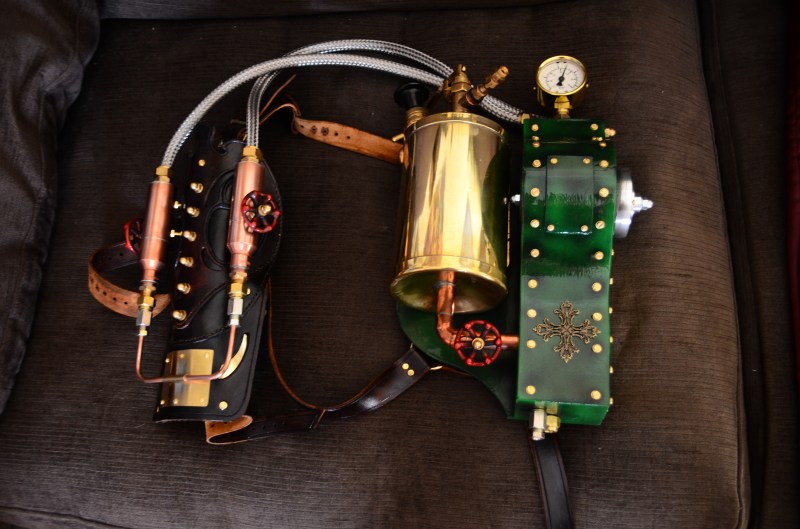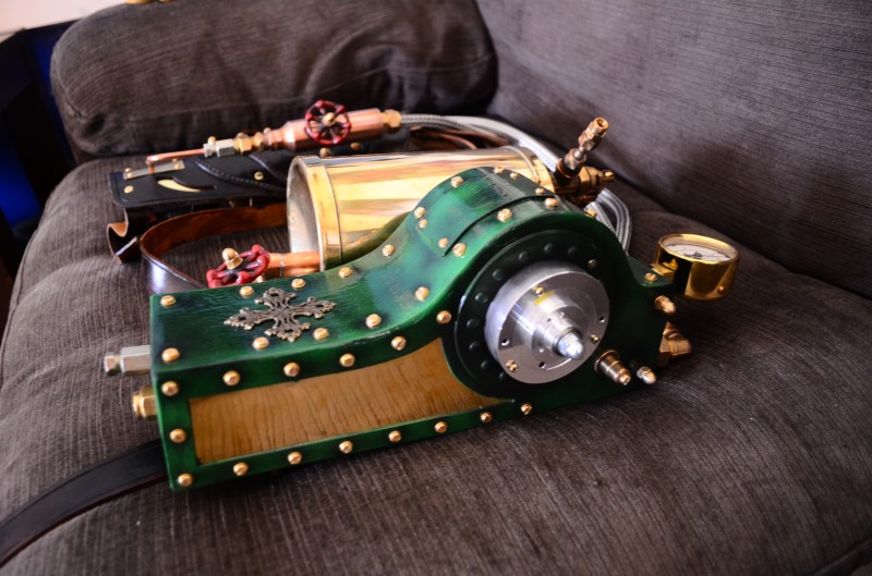 The main backpack is made from a brass garden sprayer attached to an mdf shell which is overlaid with a styrene skin with various bits attached. I tried to model the colour scheme after the green paintwork you see on some victorian beam engines.