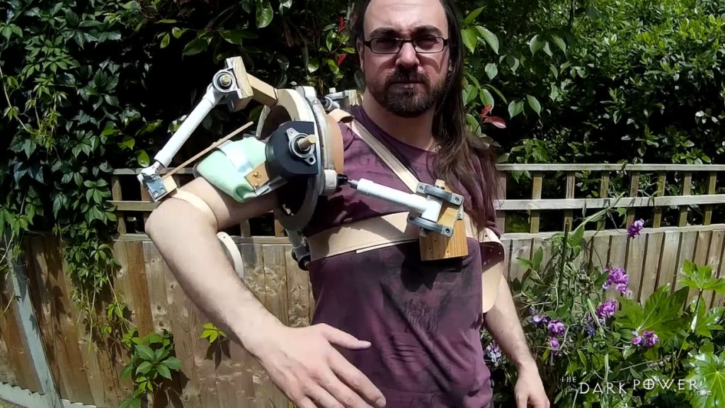 I figured that building an entire suit was a little ambitious so I focussed on doing one arm instead. It’s primarily comprised of wood overlaid with plastic but I use a variety of metal bearings to give me sooth motion. The piece came out pretty well although it was abit on the heavy side!