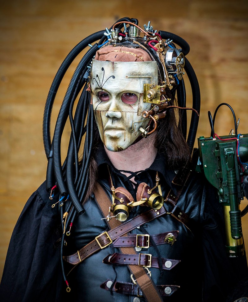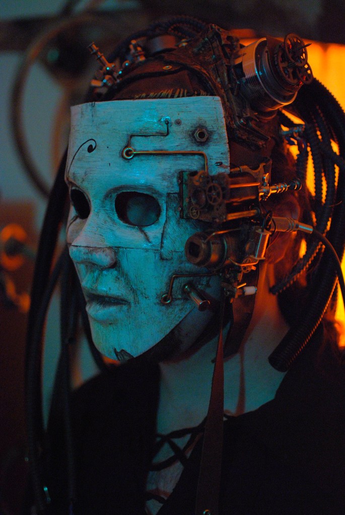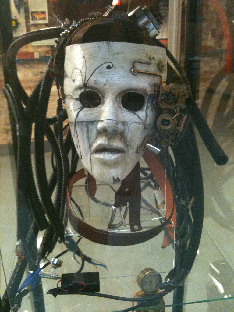 It comprises a fibre glass cast of a mask I made for a horror film ‘To my Mother and Father’ which has been ‘enhanced’ with some steampunk gubbins made from various pieces including bits from old cameras and binoculars.